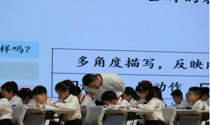 接着展示的是丽水青田县教育教学研究室刘江蔚老师,他精准定位学情,结合习作重难点,引导学生从多角度描写人物表现,多次描写人物。课堂上既见增长点,又明确改进方向。在深入讲解环节,刘老师巧妙地运用微课中生活中的熟悉的人,帮助学生理解如何从多个角度描写人物。