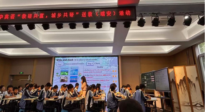 在初夏的细雨中,一场聚焦英语读写教学的深度教研于2025年5月28日在瑞安市阁巷中学拉开帷幕。温州市初中英语杨桂琴“名师送教”工作室联合温州市初中英语学科“教研共富˙城乡共研”送教(瑞安)活动,以新教材读写教学为核心议题,汇聚区域教育智慧,搭建起城乡教师协同发展的桥梁,为乡村教育注入创新动能。