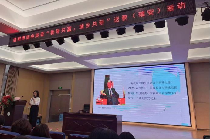乐清市教育研究培训院杨桂琴老师带来的“语篇分析视域下的初中英语写作教学探究”专题讲座,将活动推向高潮。杨老师立足新课标核心素养要求,从语篇的衔接和连贯手段等理论层面切入,深入剖析语篇分析与写作教学的内在逻辑;并结合大量书面表达实例,系统展示如何通过指代、复现等连贯策略,实现阅读输入与写作输出的有机衔接。讲座既有理论高度,又具实操深度,为破解读写教学难点提供了科学方法论。