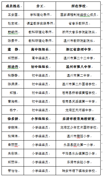 中学段:共有8名成员。普高2名,初中6名;其中温州市级教坛新秀2位,温州市骨干教师2位;中学高级职称3人次。这个群体,核心任务是塑造“全人教育”课程观,灵活运用国际先进教育理念实践于自己的课堂,逐步实现自己的教育梦想;其次是深入探究中学生的音乐学习心理,以“聚焦素养、生本课堂”为目标,形成多元风格、生动创意的教学范式;此外还要关注音乐与生活、时代的密切联系,善于对音乐文化追根溯源,挖掘音乐文本背后的深刻人文意蕴,加强自身音乐涵养。争做一名挚爱事业、业务精湛、思想活泼、胸怀广阔、富有生活情趣的优秀音乐教师。