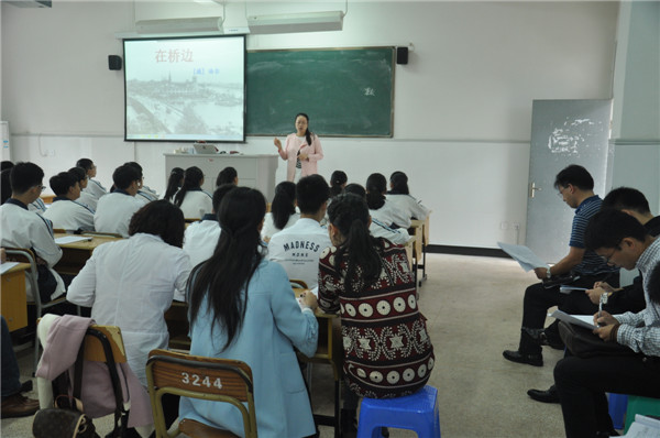 之后,黄华伟老师在《从“在桥边的老人”教学略说“欣赏”及其内容》的讲座中可谓倾囊相授,围绕“怎样教”与“教什么”的问题,提出了“我告诉你”、“你想想看”、“你自己解决”三种教学方式,在教学内容上强调要抓“重要语句”与“表达特点”,要将朗读真正落实到教学过程中。张学庐老师在肯定、赞扬开出两节优质课的两位老师的同时,也敦促在座的各位语文教师要充分利用《学科教学指导意见》一书,在教学过程中要注重品味语言、关注“怎么写”,课后要有跟进训练等等。