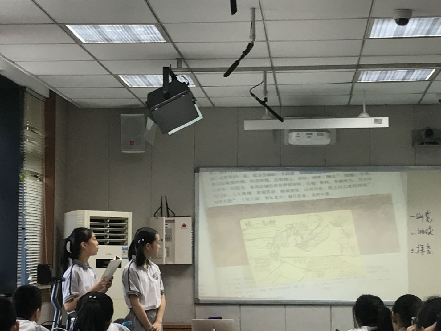 早上,三位教师各上一课,皆是新教材中的自读课。朱彬茹老师执教的是《梦回繁华》,学生默读课后阅读提示,并举手归纳本课自读任务:浏览;细读;探究。随后,学生开始浏览全文,完成作业本上的“学习任务一(梳理说明结构)”。一位学生在7分钟时便已经完成任务,朱老师继续等待,直至学生全部完成。有意思的是,朱老师先请第一位完成的学生自由分享自己快速浏览的过程与方法,为其他学生提高阅读效率提供了范例。课文脉络完毕,朱老师提出了一个疑问:这是一篇说明文,为什么标题为《梦回繁华》,取作《清明上河图》不是更清楚吗?一下子就从宏观的梳理带领学生关注《清明上河图》的历史背景、文化心理,让学生明白说明取题的特点。在细读环节中,学生通过小组合作,运用绘画法、拆字法、问文体法等丰富方式展现了文中所写的“繁华”,生生互促,异彩纷呈。之后的探究与拓展自然而跳脱,很好地展现了自读课的特点:“让学生自己读,把教读课学到的方法运用到自读课中,自己去试验、体会”(温儒敏语)。