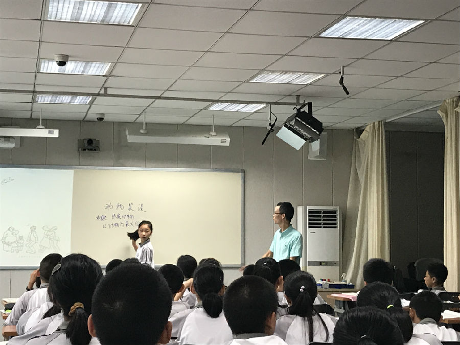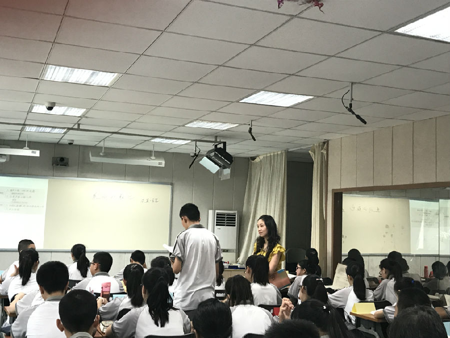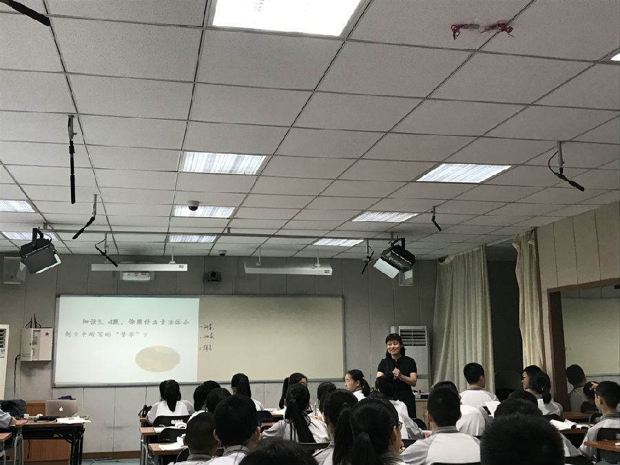 踏入逸夫楼,是早自习的下课时光。楼梯上下,学生捧着书奔忙着。录播教室里已经挤满了前来听课、学习的各校老师们。