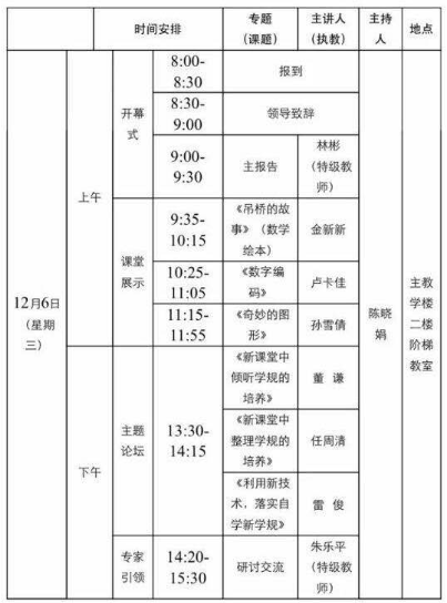 为了引领小学数学课改的特色发展和内涵发展,加强学生的学习常规建设,温州市于12月6日在市实验小学举行第七届小学数学课改领航现场活动,希望工作室全体成员能准时参加研讨活动,具体安排如下: