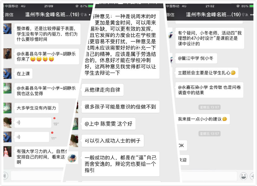 13:30活动开始,按照事先安排,由倪小冬老师在微信群里说课《时间都去哪儿了》,时间15分钟。小冬老师说课由本校学生放假时间利用调查引出,然后安排了7个活动环节。分别是猜谜语、认识时间我的47小时调查结果、我理想的47小时的设计、讨论周末是什么、认识时间管理、课后延伸设计我的下个47小时。引导学生放假在家如何利用时间。在倪老师讲课的同时,吕陈栋老师利用自己的技术特长进行了说课纪录。