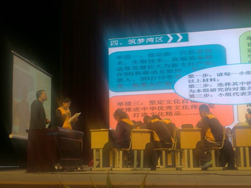 会议伊始,来自温州外国语学校的陈昆亲老师为我们带了了一节紧扣时政热点的综合复习课——《阳春三月 潮起湾区》。陈老师从十二中与外国语学校的校园标语巧妙切入,引导学生关注时事热点,在学生踊跃的回答中引出了课堂的主题—湾区。随后通过“湾区概况”、“湾区寻踪”、“湾区追梦”和“筑梦湾区”四大主要环节,引领学生从时政热点出发,全方位多角度地联系考点,让知识在情境探索中得到锤炼应用。陈昆亲老师的课堂主题清晰,思路明确,复习手段张弛有度,体现了陈老师多年累积形成的扎实教学功底与高超专业素养。