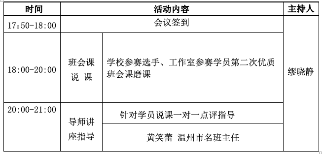 四、参加人员:浙江省、第二期温州市、瓯海区黄笑蕾名班主任工作室全体学员,瓯海区外国语学校参加区第八届优质课比赛的班主任。