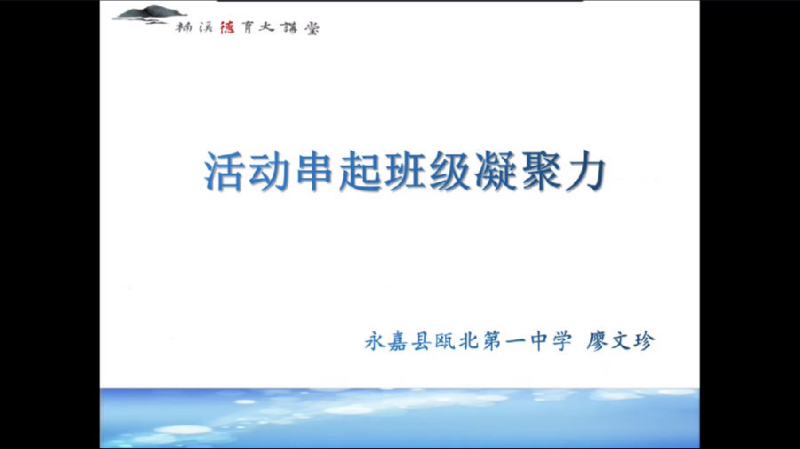 活动开始由获得温州市学科骨干教师的廖文珍老师分享他的观点报告《活动串起班级凝聚力》。廖老师从七、八、九三个不同年级段的不同特点,采取不同层次“通过活动打破学生防御层,形成班级凝聚力”“通过活动树立强烈的集体意识,提升班级凝聚力”“通过活动释放压力,巩固凝聚力”,循序渐进、有针对性地的开展班级活动。