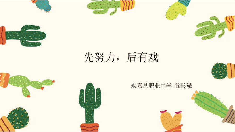 第二环节由永嘉县艺术节优秀指导师徐玲敏老师带来《先努力,才有戏》的主题班会说课。潘老师根据中职学生的特点,确定了教育目标和重难点,以学生中最典型的困扰为切入点导入本节班会,并设计了“摩天大楼”、聆听故事、回味经历、落实行动的知情意行四大板块,让学生认识到先付出努力,后看到希望,最后取得成功的顺序。通过老师的励志故事和自己的成功经历激励自己,让自己获得自信,最终把目标落实到具体行动上。整堂课始终围绕着学生自身和学生的身边人,让学生能真正的有体验有收获。