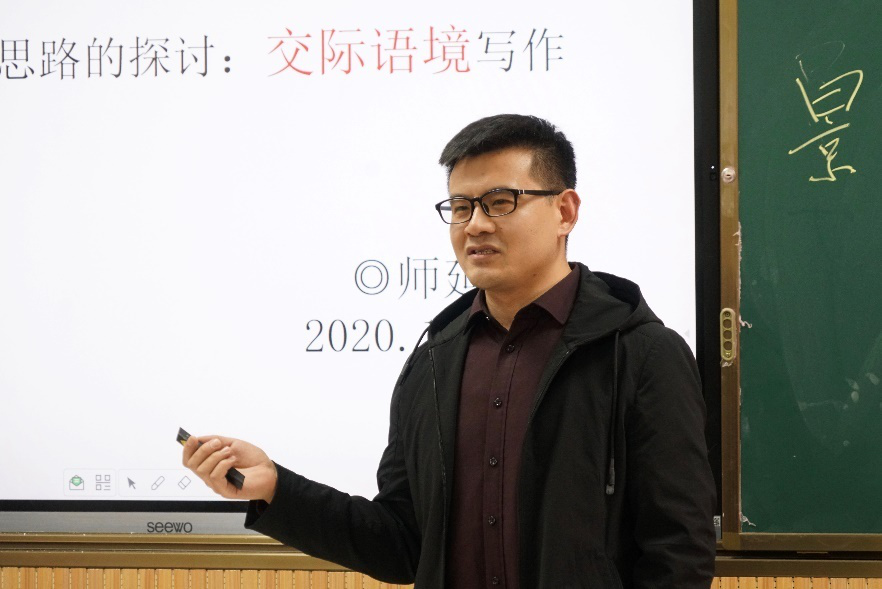 精彩的两堂课后,实验中学的师延锋老师做题为《一种写作新思路的探讨:交际语境写作》的讲座,并对这两堂课作精到的点评。
