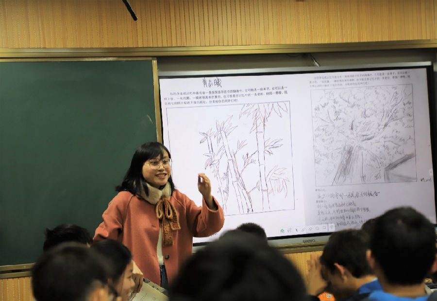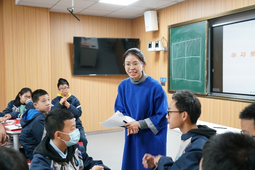 第二堂邱切锲老师的课题是《写景,谁主浮沉?》,邱老师引导学生聚焦《与朱元思书》中一段写景的句子——“水皆缥碧,千丈见底……好鸟相鸣,嘤嘤成韵。”思考景物特征和写作目的的关系。然后请学生写一段以景物描写为主的文字,来劝说校长在校园中种植香枫或竹子。在教师精心创设的语境、精巧的写作支架、精准的三维度自评与循循善诱的指导中,学生把握住景物和写作目的的关联,从写到改,渐入佳境。