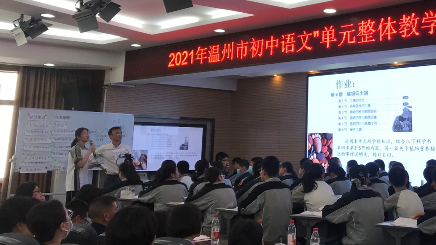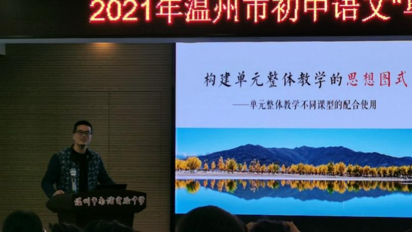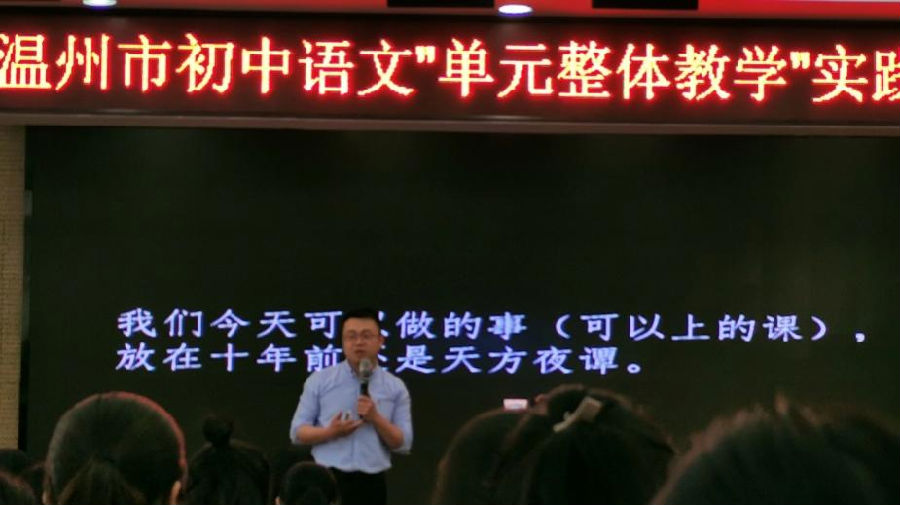 4月23日,程日东名师工作室成员与各区县语文教师代表齐聚温州市南浦中学,参加温州市初中语文“单元整体教学”实践研究研讨活动。本次活动由王汉雷老师、叶晶晶老师开课,张寰宇老师评课,邀请谢建丰老师、周小云老师、郭传兴老师和韩银雪老师开展教研员论坛。
