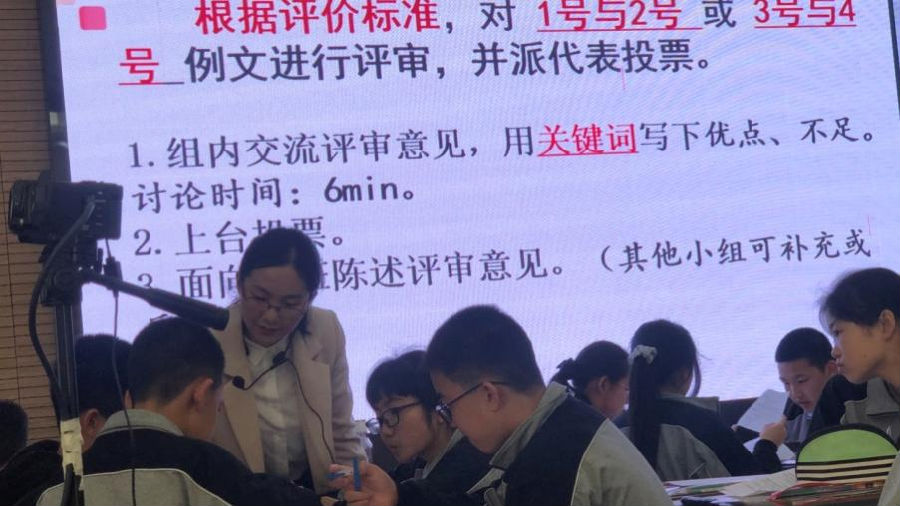 第二节课,是南浦实验中学叶晶晶老师带来的《事理说明文写作——项目化学习“助你备战科技节”子成果修订》。叶晶晶老师以学校科技节为契机,在课堂之前已经带领学生用了二十多天的时间,完成科技节水火箭、投石机的《活动手册》和《参赛指南》等,为下一届学生参加科技节提供支持。学生通过整合讨论完成了评价标准,并根据评价标准对例文进行评审与投票,参考评审意见修改组内作品。叶老师强调文章的写作与解读都应站在读者角度,注意文章的逻辑顺序,心有读者,以终为始。
