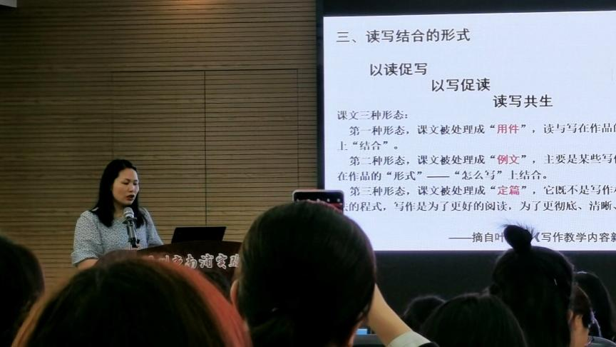 文成县教育研究培训院教研员周小云老师分享了《单元整体架构下的读写课型设计》。周老师提出写作教学的现状:写作课通常仅仅是学生写作的场所,而不是教师教学生写作的场所。据此,周老师认为要在单元整体目标统摄下,抓住阅读和写作的契合点,在阅读教学中融入“写”的积极因子,在写作教学中发挥“读”的引导效应,从而使读与写相互作用,和谐共生,最终的目的指向单元目标的有效达成。