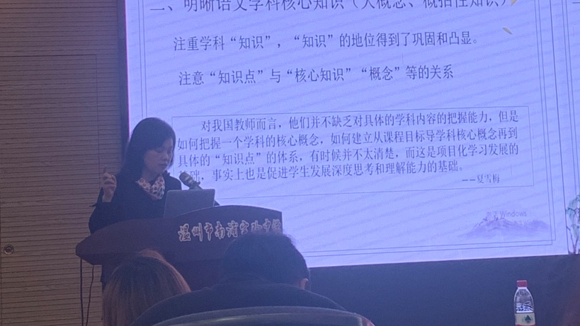 经开区沙城中学韩银雪老师做了题为《语文“大概念教学”问答录》的报告。韩老师列举了一线教师们困惑的关于“大概念”的一些问题,将这些问题归类为概念界定、价值定位、目标提取和路径设计四个方面,并对这些问题分享了自己的观点,为老师们清晰地阐述了“大概念”的内涵。