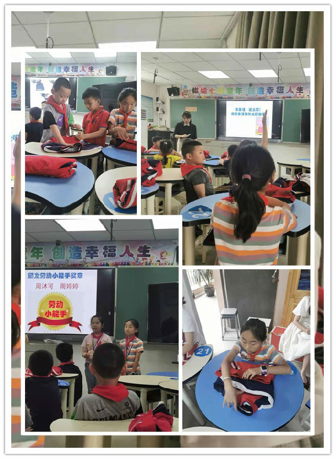第四节课是由景山小学的马茅茅老师给二年级学生带来的《家务劳动我能行》。马老师通过我演你猜及二年级学生家务劳动情况调查表引入。接着马老师以小猪佩奇从不爱做家务劳动——不会做——奶奶不让做——认真做为主线,让学生通过角色演绎、动手整理书桌、叠衣服比赛等手段,让学生爱上做劳动。通过表彰两位爱做家务劳动的学生让学生了解到家务劳动的好处。最后马老师给每位孩子准备了一张家务劳动我能行实践活动单,让孩子们在接下来的日子里记录自己的家务劳动情况,真是学之于课堂,用之于生活。
