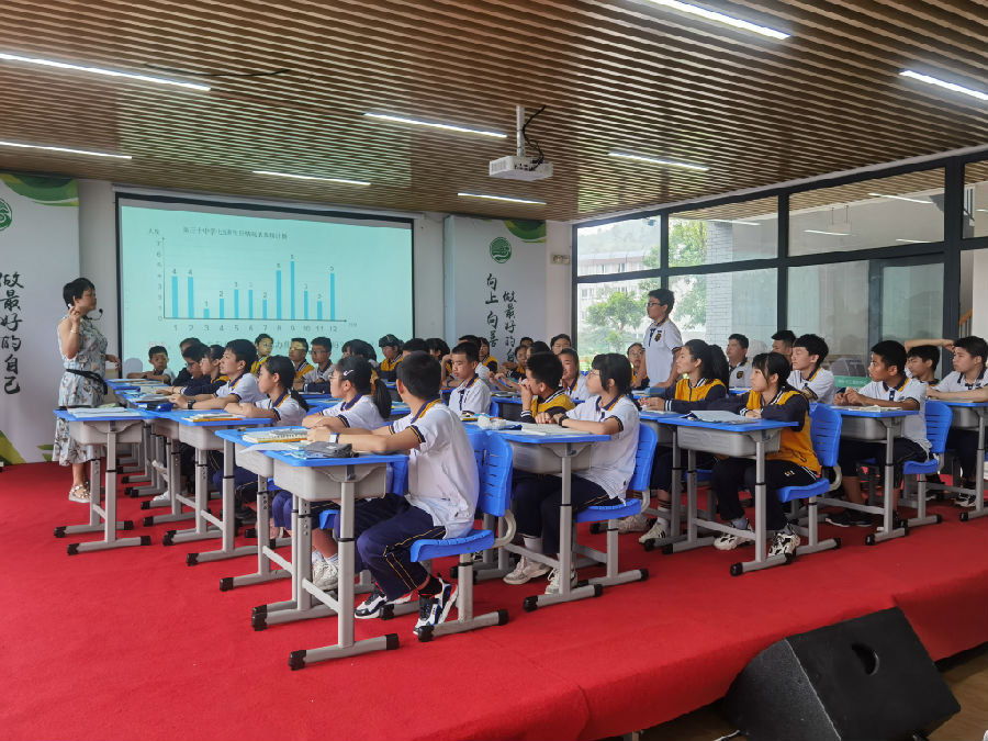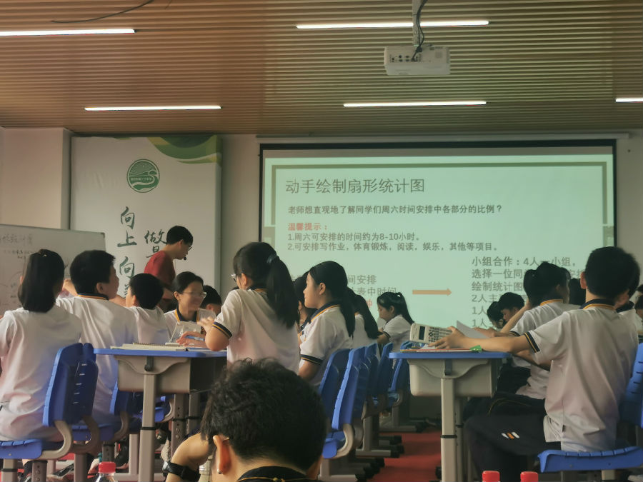 三十中的陈爱秋老师与潘智勇老师分别呈现课例《6.2条形统计图与折线统计图》和《6.3扇形统计图》,依托学生小学储备的经验,拓展加入新知,揭示数据统计的重要意义。随后,叶茂恒老师分享了目前初中统计知识教学存在的常见误区,对两节课进行了点评,赞赏两位老师在教学中以学生为主体,让学生通过实际操作充分体验新知的做法。叶老师基于社会发展需求和学生习得经验的规律,追问两节课的细节之处,与参会成员探讨合适的处理方法,引发众人的思考。