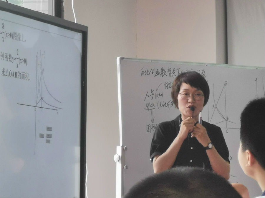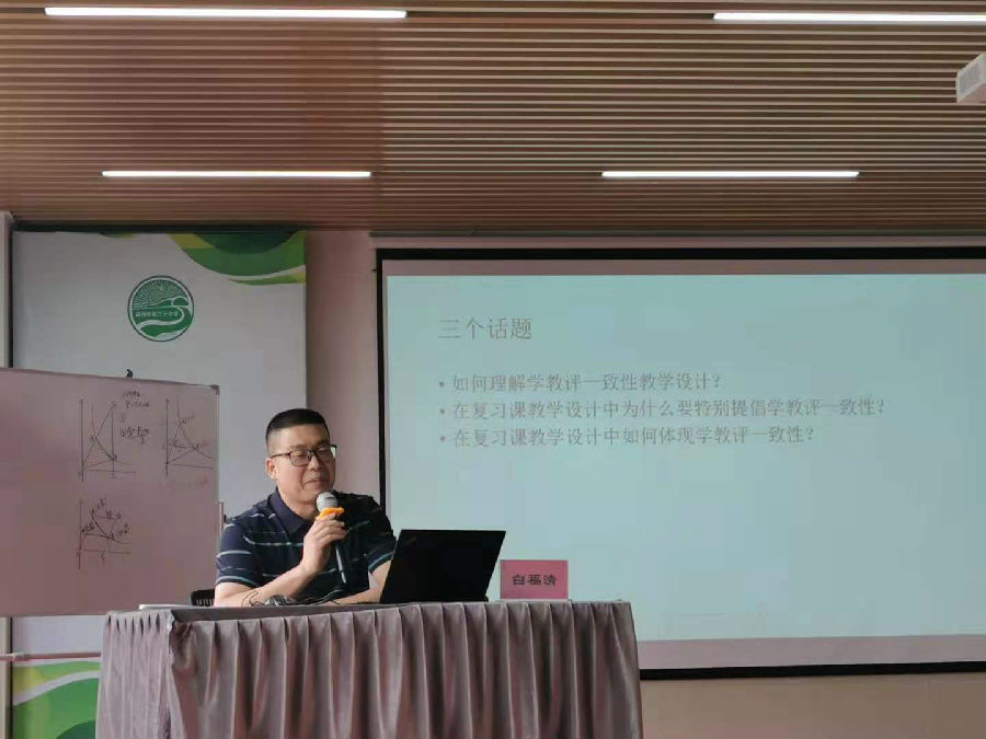 下午,梧田一中的张乐老师带领学生探索反比例函数背景下的面积问题,连串的变式环环相扣,及时的追问和恰好的点拨让课堂一直处于活跃的氛围中。白福清老师结合本堂课开展《学教评一致性理念下的复习课教学设计研讨》,强调立足于教学目标进行教学设计,注重将目标任务化,并用两个实例提出在教学设计中应对目标进行评估,落实目标。