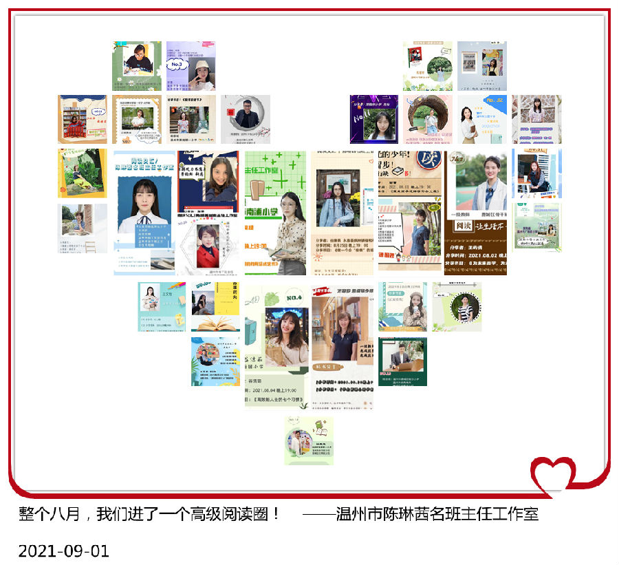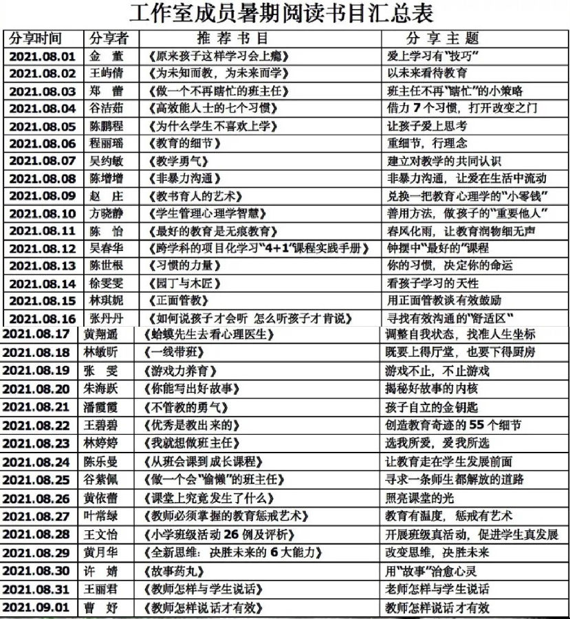 为营造浓郁读书氛围,打造书香工作室,让读书成为一种习惯,以阅读构建班主任专业成长平台。暑假8月,我们在陈老师的带领下开展了“教师阅读交汇”活动,由32位学员每日分享一本书籍,畅谈读书感言。不积跬步无以至千里,32天阅读交流的坚持,让我们在专业书籍上拓宽了视野,学到了丰富的专业技能,悟到了更多的师生相处模式!