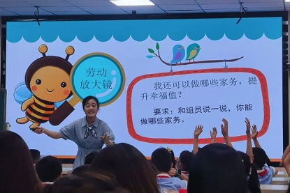 第二节课是由徐雯雯老师带来的《劳动一小步,幸福一大步》。从开始的看动作猜职业游戏预热,引出让孩子们去欣赏平时劳动者的一天,创设情境在体验中判断,让孩子们去感悟劳动的美好,原来劳动是快乐的,是为了给大家带来幸福。