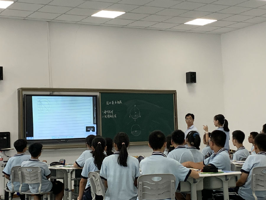 高铁新城实验学校黄双华老师在开展《圆的基本性质复习》中,先通过课前检测引出并强调了本节课的知识重点及以往作业中的易错点,再进入思维的进阶训练。黄老师的教学设计主线清晰,一图多用,将给定的多个条件与结论互换位置产生多样的变式,让学生深刻感受本节课“百变”中的“不变”即是垂径定理,使课堂教学实现和谐与统一。