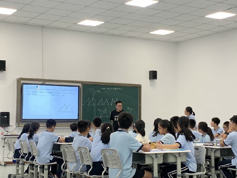 瓯海区梧田一中的徐璋老师则给我们带来了《全等三角形复习课》展示课。他借助变换两个全等三角形纸片的位置将全等三角形平移型、对称型、旋转型、三直角型等模型一一展示。聆听、提问、思考、书写、陈述、质疑、评价等课堂互动不断引领学生把知识和方法整理深化。