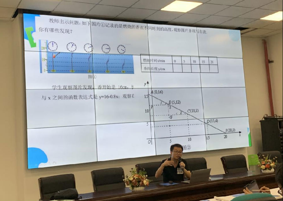 接着陈伯勋与大家分享了《一次函数教学内容分析与作业设计》 观点报告。他先展示了小学、初中、高中与一次函数有关的教材内容,反映出教材衔接的有序性,必要性,对于知识和思维是层层推进的。再重点从初中阶段教材内容具体分析设计的价值、意图与本质,最后指出作业设计应达到精选、分层、多样、匹配的要求。陈伯勋老师的观点给在座各位老师带来了教学的新思路、新思考。