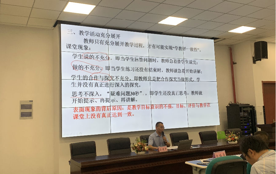 活动的最后,由金特结合本次讲座主题即“学教评一致性理念”对以上两位授课老师进行了专业性点评,再展开说明了何为学教评一致性及相对应的几点教学意见。他指出,对于课堂教学而言,教师的教,学生的学,以及对学习的评价应具有目标的一致性,要保证学习目标的始终呈现、教学活动的充分开展、教学评价的全程跟进。其中最为关键的是“评”,形式包括但不局限与教师的评价与追问,学生的讨论与点评也可以成为“评”的有效手段,总之要无时无刻将这一环节贯穿课堂的始终。