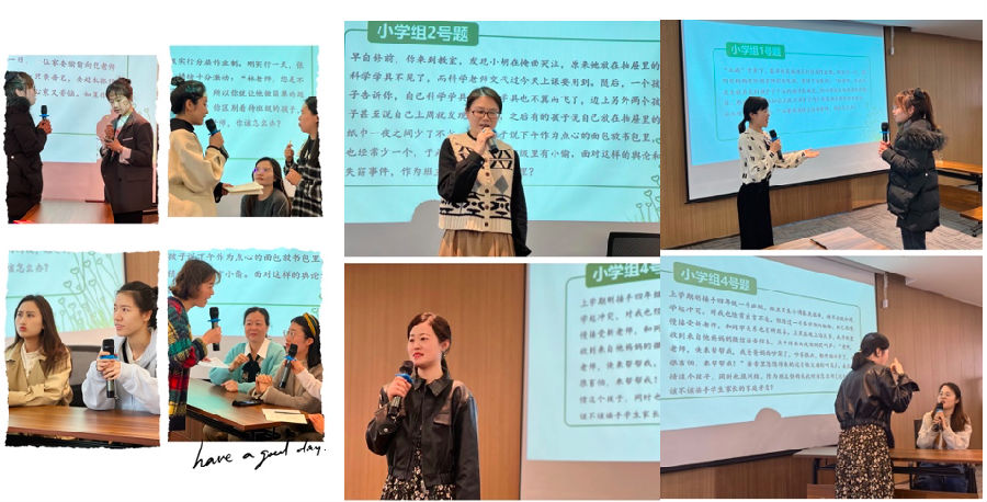 情境模拟开始,曾老师将所有学员分为八个小组进行头脑风暴,分配各学段问题,让学员们集思广益,现场进行情境模拟问题的分析、解决、演绎和探讨。
