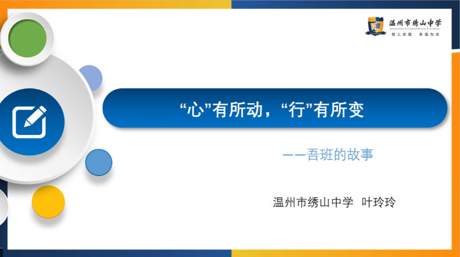 首先由温州市绣山中学叶玲玲老师带来《“心”有所动,“行”有所变——吾班的故事》的讲座。讲座中,叶老师着重分享了自己所带过的两个班的故事——2016级(20)班和2018级(5)班。向学员们揭示了在班级管理中要善于挖掘和培养的学生良好习惯的养成并时刻关注学生阶段性成长需求。让大家明白了初中生的习惯养成关键看七年级,七年级关键看七上,七上关键看七上第一个月!关于习惯养成,叶老师还分享了一个她最有感触同时又最有收获的点,那就是好习惯养成,要从最细微处做起!在孩子刚入学,她会关注开学后的所有第一次,并对所有第一次都提出标准和要求,给予方法和指导。她认为“第一次”在习惯养成中具有里程牌的作用!再细微也不放过!比如她培养过学生一个桌椅齐、清的习惯,令人印象深刻。这一做法一开始只是想避免“破窗效应”的发生,后来产生了神奇的“配套效应”,那就是连同教室里图书角、卫生角、黑板报等各处都秩序井然了。最让人惊喜的,是产生“蝴蝶效应”,那就是帮助学生更快更好地养成了更多好习惯.如课前准备习惯、整理习惯、个人卫生习惯等,甚至进一步培养了坚持、注重细节、更加自律等品质。所以,真的体现了这样一句话,教育无小事,事事皆育人。