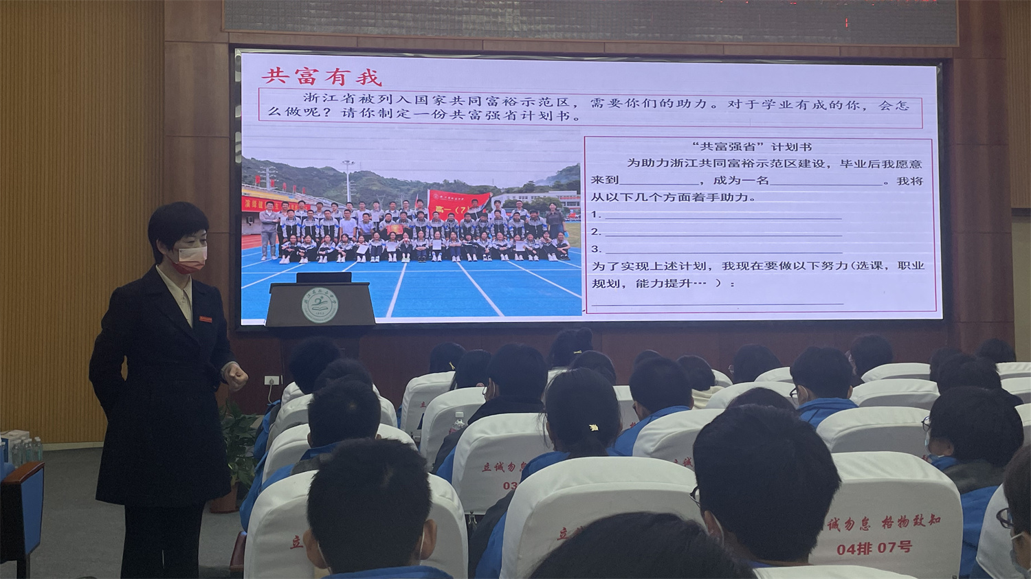 第二节主题班会是由朱金峰老师为我们带来的《青春奋斗心,共同富裕行》。上课伊始,朱老师展示几组对比鲜明的照片,引出班会主题“共同富裕”。再从源头村书记陈小静、陈立群校长和李云清医生的光荣事迹中,让学生认识到为着物质的、精神的共同富裕,保持青春奋斗初心的重要性。接着,学生进行情景剧参演和小组讨论等活动,认识到互帮互助精神共同富裕的重要性。共富有我,我的样子就是青春的模样,奋斗青春的模样就是中国的模样。最后,学生在学业有成的情境下填写共富强省计划书,并进行自己的职业规划。通过这节课,学生充分认识到精神共同富裕的重要性,并为之努力奋斗。