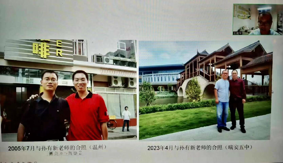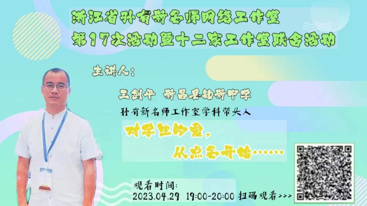 为了进一步引领工作室学员提升师德技能修养,重视班级文化建设,打造班级特色品牌,在浙江省孙有新网络名师工作室的统一安排下,2023年4月29日晚上七点,温州市项延唐初中名班主任工作室、龙港市项延唐班主任工作室联合其他十多个工作室,一起学习聆听来自浙江省孙有新名师网络工作室学科带头人、绍兴市新昌县知新中学优秀班主任王剑平老师题为《对学生的爱,从点名开始》的讲座,分享着他的带班理念。王剑平老师是高级教师、新昌县首届名班主任,曾获绍兴市家长满意教师、新昌县优秀教育工作者,在课题、论文上成绩斐然,造诣颇深。