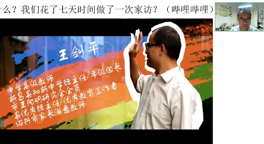 在讲座的第二部分,王老师重点介绍自己的点名、家访、请学生吃饭等特色活动和实践感悟。王老师始终在做一项深层次的走心教育,他是在实践中研究如何走进学生心理。他的绝招之一就是和学生一起吃饭,地点是在家里,方式是自己做菜;他的绝招之二就是走进每一个原生家庭家访,地点是学生家里,方式是走出校园。他在讲座中,呈现一些报道和视频记录,让我们隔着屏幕都能感受到菜肴的香味和满满的感动。王老师最后总结到:走近学生,走进学生,和学生一起成长,共同进步。对学生的爱,从点名开始。