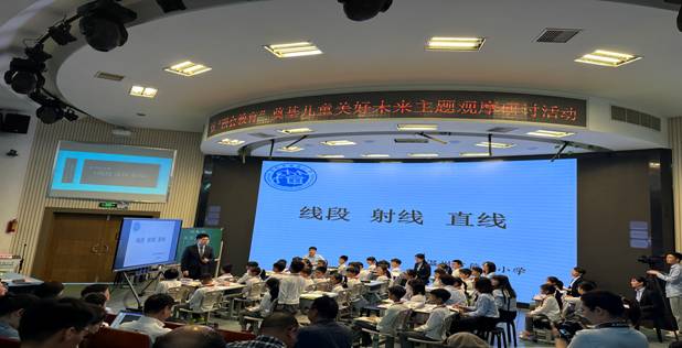 接下来的环节由籀园小学丁豪侠老师带来《线段、射线、直线》的数学课堂;丁老师先是从对线段认识开始,让学生说说线段的特点,在回顾线段特征的基础上让学生去测量线段的长度,在对线段长度的操作中认识端点、用字母表示线段。再通过对激光笔的讨论学生认识了射线,并讨论掌握射线的特征,在研究射线时教师又顺势引出直线的特征。互动环节,教师精心设计了让学生用身体表演猜线游戏,设计研究一个点能画多少条直组的练习。整堂课学生始终全情投入,热情高涨。