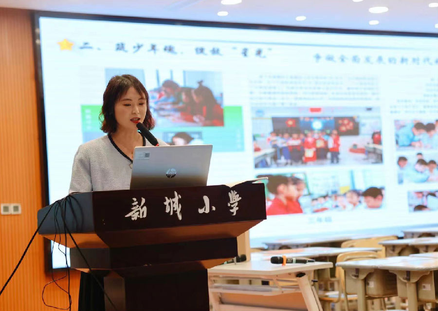 接着,新城小学叶梦媛老师带来观点报告《蜕变成蝶,璀璨成星——星蝶中队带班育人方略》。叶老师从三个维度落实育人目标和理念:立少年志,展露“星芒”;铸少年魂,绽放“星光” ;润少年心,闪耀“星辉” ,构建“星光闪亮”体系,引领班级学生针对自己的问题、班级的问题,不断擦亮自己生命的亮度,从孩子们的个人品格到集体精神,再到学生、教师、家长成长共同体,实现班级发展目标。
