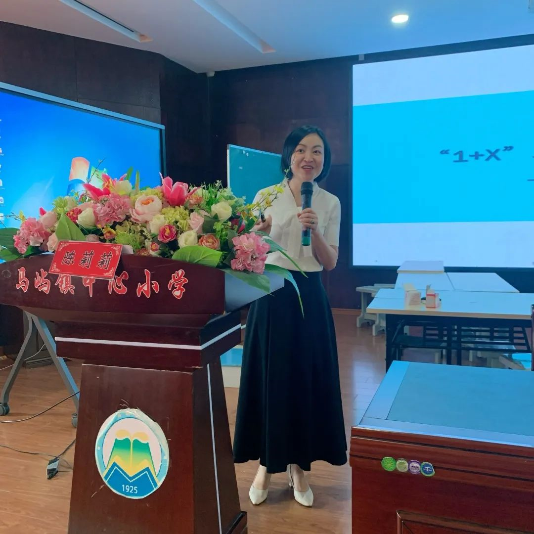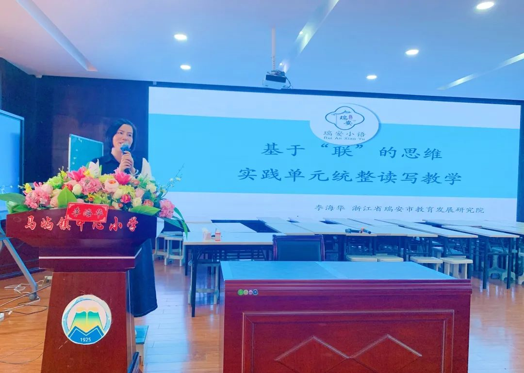 活动最后,瑞安市教育发展研究院李海华老师带来《基于“联”的思维实践单元统整读写教学》的讲座。李老师剖析了单元统整读写与联读的共性,分享了“1+X”联读的创新路径:课文+、单元+、学习任务+。她倡导老师们巧妙运用温州市的《小学语文“1+X”联读》研究成果,来丰厚单元统整读写课堂。同时,李老师高度肯定了马屿镇小语文教师团队的写景主题单元的统整读写教学,赞赏作课老师进行多路径的课内外联读,达到宽阅读,强习作的教学效果。同时,李老师对马屿镇小的单元统整提出了宝贵建议,她指出,可以抓住马屿镇小百年校庆活动这一契机,结合不同年级写景类课文的表达要素,创设制作“百年马小,最美马屿有声书”的情境,各年级围绕写景单元开展序列活动进行“巧联趣写”。如三年级同学分几个方面向客人介绍李总理的母校马屿镇中心小学,四年级做马小、马屿游览路线图,五年级结合动静态描写介绍马屿风光,六年级寄情于景表达对母校、对家乡的热爱,形成真实性、序列化学习活动任务链,达到写景类主题单元统整读写教学的最优化。
