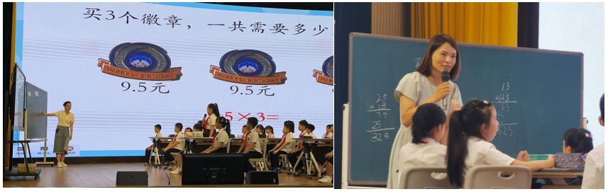 上午场第一节课由温州道尔顿小学年轻教师李晓迪老师带来《小数乘整数》。李老师通过计数器引入,利用整数乘法延伸、串联、迁移到小数乘法。她以学生为中心,利用多种方法的并联反馈,多种算法的算理沟通。让学生对问题进行分析、逐项探究,明确小数乘整数笔算的算理及算法。引导学生对比小数乘整数与整数乘整数的联系与不同,教学环节设置环环相扣,学生学得扎实有效。
