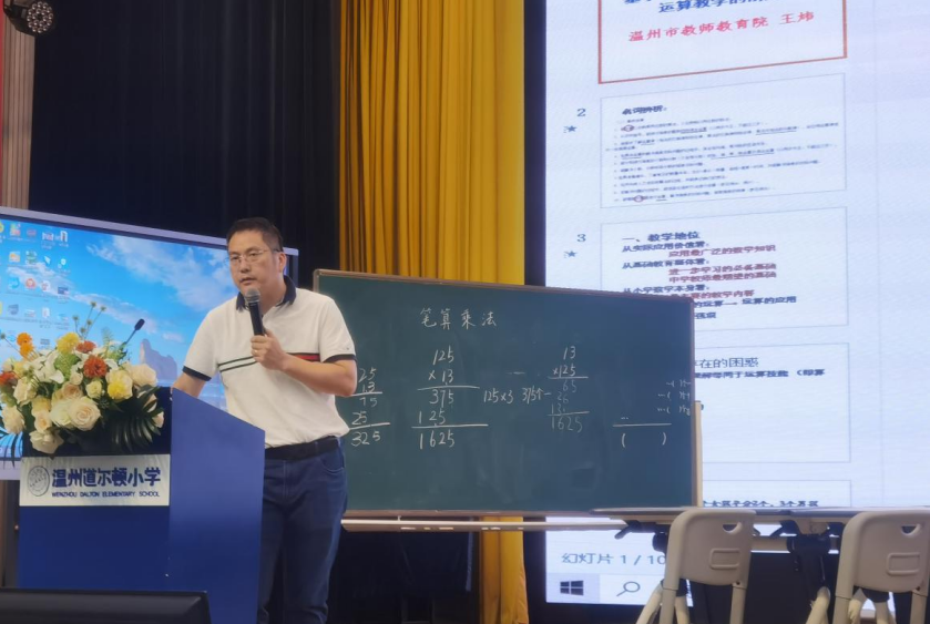 接着王老师从计算教学的现状出发,提出了在运算教学中的疑问,引发大家思考,明确“基本”的运算技能是必须的,但要把握好尺度,理性审视和推进运算一致性。允许基于运算的实际意义来分析算理,淡化一致性的要求。同时,他还提醒老师们,要切实重视小学生实际的能力水平,降低“数学化”的程度。建议恰当把握教学逻辑的严谨性,鼓励学生个性化地分析算理。