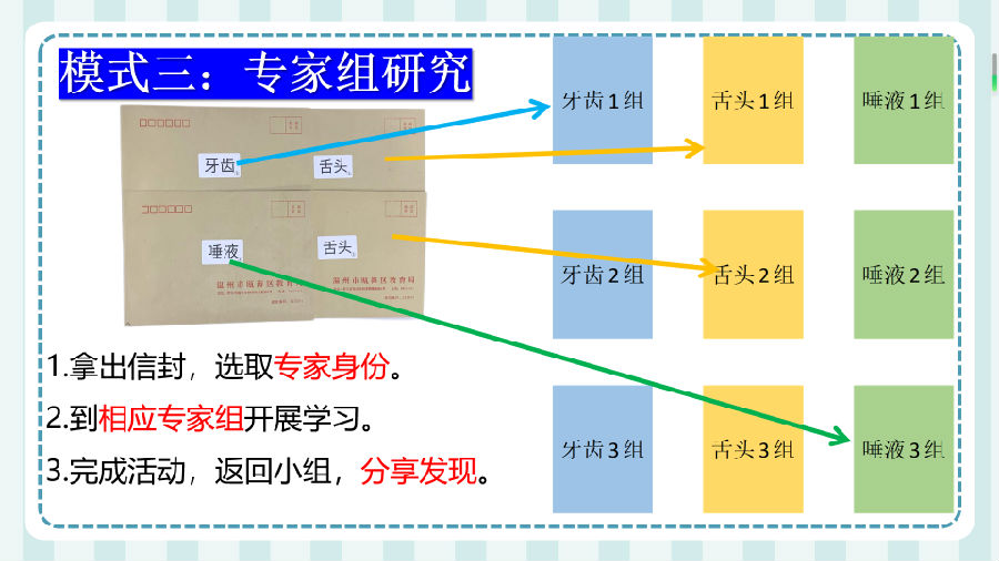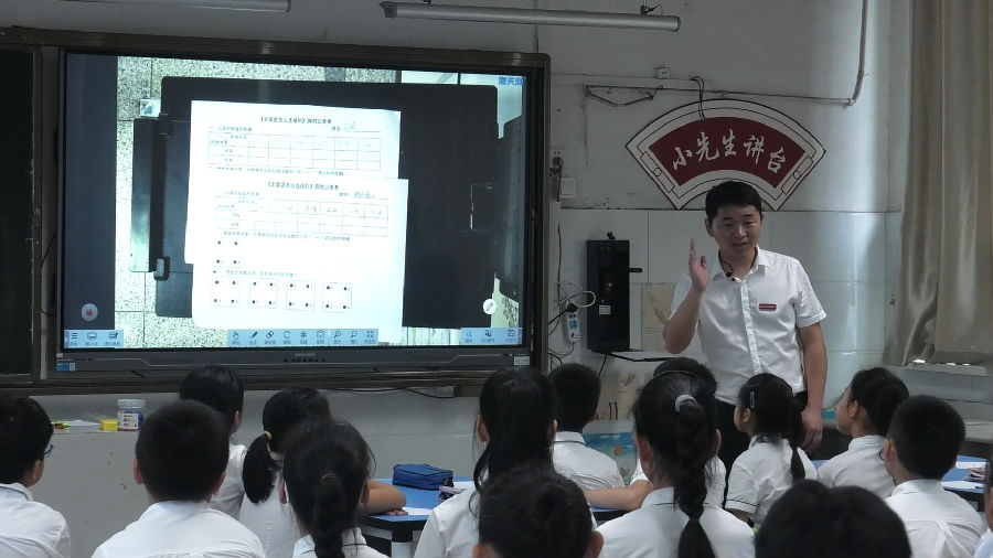 在三种模式的引领下,林老师细腻地跟大家讲解着如何进行操作,特别是几个关键支架的呈现,比如小先生板可以支持每个孩子有一个讲解的舞台,比如学生表达的句式是“大家听我说”“你们听明白了吗”让孩子之间的交流是一种文化,比如坐姿与轮流的规则可以让多中心领学是有秩序的。在林老师的引领下,我们对新概念有了新的认识,发现这样的课堂是素养进阶的一种表现,是素养发展全员化的一种优质路径。