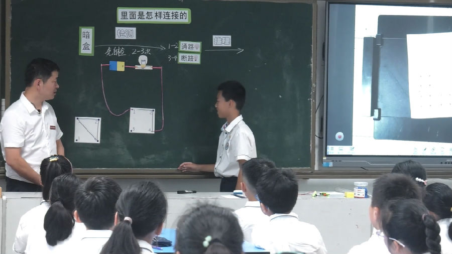 从大单元设计来看,本节课是对第2、3、4课两个概念的理解与应用,一是电流能形成一个完整的通路时,灯泡才会亮;二是电路检测器的使用是一个“先自检并重复检测2-3次”的规范操作过程;除此之外,这节课本身还应该发展学生的一个大观念,暗盒实验是一种通过规范有序的检测,再根据检测结果进行合理推理的过程,暗盒实验在生活中是多方面存在的。