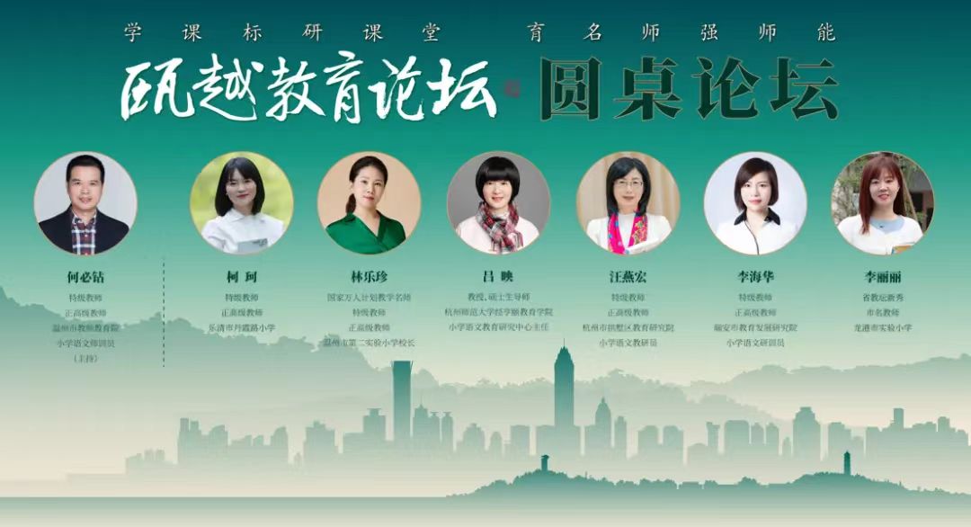 圆桌论坛环节特邀杭州师范大学教授、研究生导师吕映,杭州市拱墅区教育研究院小学语文教研员汪燕宏,特级教师和正高级教师林乐珍、李海华、柯珂,省教坛新秀和市名师李丽丽6位嘉宾、与特级教师和正高级教师、温州市教师教育院小学语文师训员何必钻(此次论坛主持人),就语文学习任务群与大单元教学的关系大单元教学的“大”体现方面,基于现在统编教材滞后新课标的时空断裂点,一线教师如何对接、顺应任务群理念等问题进行深入探讨,嘉宾们畅所欲言,共话大单元教学的“为何”和“何为”。