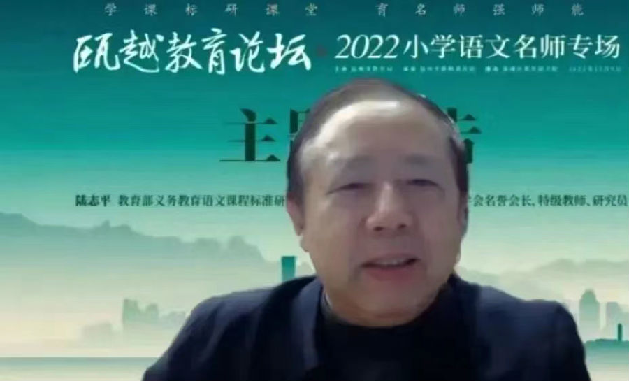 活动最后,教育部义务教育语文课程标准研制组核心成员,江苏省教育学会名誉会长陆志平以《语文学习任务群理念下的大单元教学设计》为题进行专题报告,他高度评价了温州小学语文对大单元教学的探索,能聚焦热点难点问题,区域推进扎实、行动有力。陆老师指出以学习任务为载体的单元教学设计,需要教师统筹单元的多种元素、多重教育价值,整体设计单元学习情境和学习任务,设计连贯的教学活动,分段、分课有序实施。他指出语文学习任务群落实到课堂的中心环节是单元整体设计,关键是发挥学习任务的载体功能,设计好真实情境中的学习任务。
