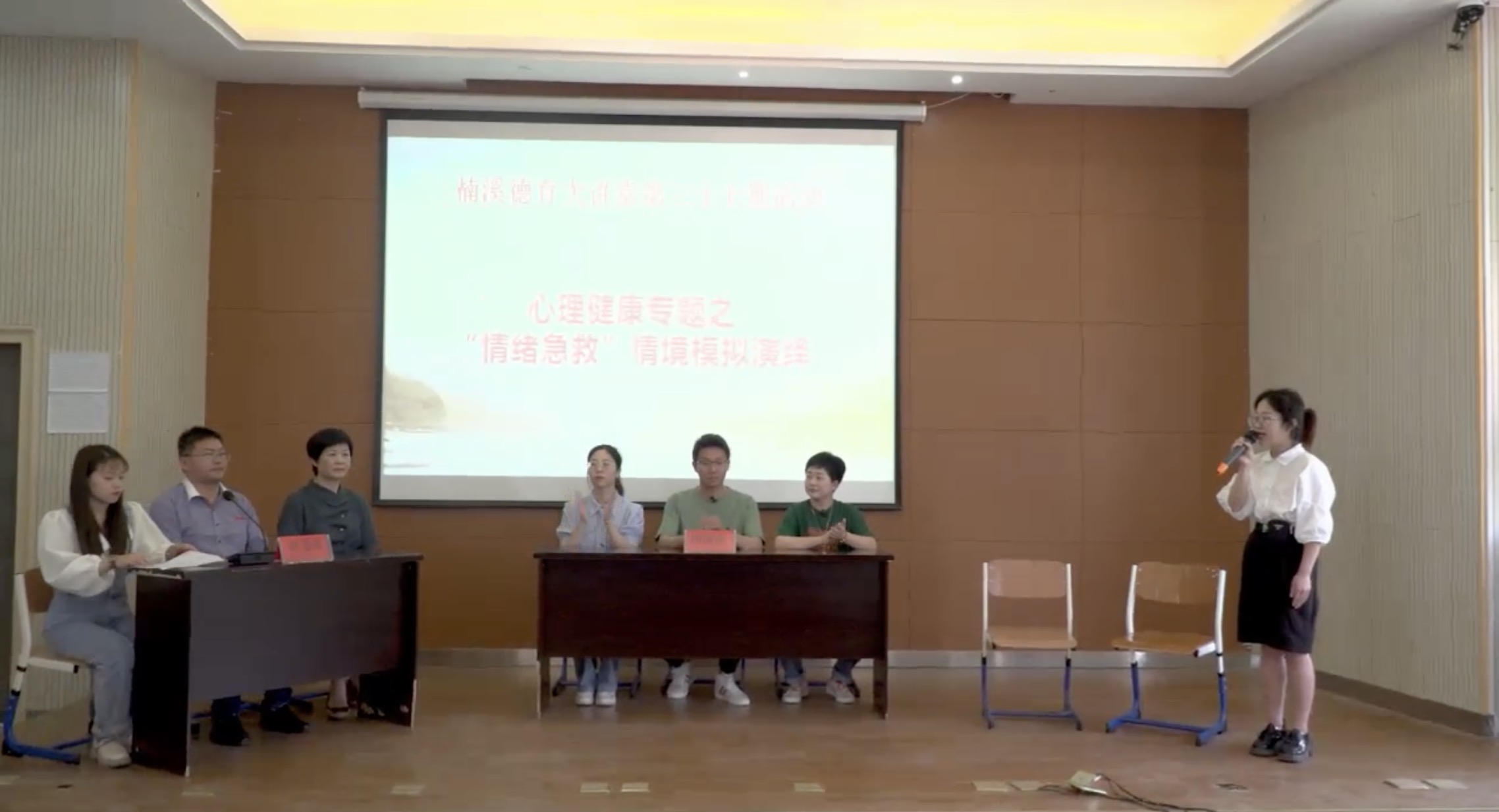 本次活动的第一个环节是情绪急救演绎。本环节由永嘉县班主任基本功大赛一等奖的潘碧凡老师主持。潘老师首先就情绪急救环节的具体步骤做了详细的介绍说明。随后,由温州市首届情绪急救模拟比赛一等奖获得者徐优贤老师,携永嘉二中政教处主任王良芝老师、浙江省中小学班主任基本功一等奖获得者陈丹丹老师、温州市中小学班主任基本功获得者周建丽、徐力雷等老师,共同演绎棘手“情绪事件”。面对学生的愤怒和崩溃,徐老师用她的温柔、亲和力,共情的教育艺术,循循善诱,引导学生说出藏在情绪背后的需求。进一步沟通交流,学生慢慢平复情绪,从而智慧地解决问题。徐老师的一言一行,一姿一态,无不呈现出教育人的精彩。随后,在陈述原因,解决策略和评委提问这三个环节,徐老师从学生的情绪问题出发,了解学生情绪触发的缘由,深度剖析个体行为背后内在深层次的真实诉求。立足学生,由表及里、由点及面为学生提供教育缺失的弥补方法和策略,通过有效的沟通和介入,建立良好的师生、家校信任关系,帮助学生化解情绪,探索解决方法和应对策略,找回学生的价值感和归属感。