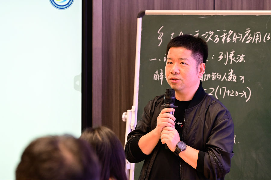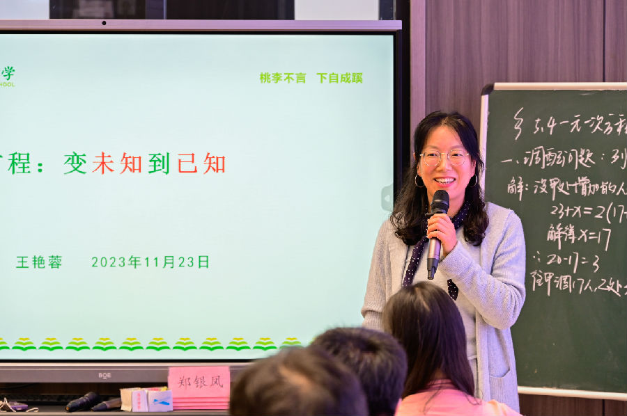 课后,龙湾区名师、工作室助理王艳蓉老师以“方程:变未知到已知”为主要观点进行分享,王老师首先分析了方程在初中学段的分布,并点明方程这一主题的难点在于应用。而后,以具体题目为例,提出三点思考:一是算式与方程有什么不同,哪个更简单?二是怎样让学生逐步建立方程模型?三是如何突出问题解决的策略、思想和方法的引导?温州市名师、工作室导师邱伟成老师以“随心”为题做分享,表达了对老师而言要课由心生,对学生而言要随心所欲的观点。邱老师还结合新课标的大单元教学、整体性教学以及项目化学习,对教师课堂教学提出了建议。肺腑之言,所以动人。龙港市数学教研员陈治国老师以传统课堂与现代课堂的异同为切入点,认为数学课堂要指向学生的核心素养,要培养学生的数学表达和数学思考。并把教育比喻为“放牛问题”,其幽默风趣的语言使学员们收获颇多。