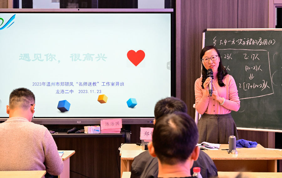 11月23日下午,温州市郑银凤“名师送教”工作室第1次活动暨工作室开班仪式在龙港市第二中学举行。浙江省特级教师、龙湾区初中数学研训员郑银凤,龙港市初中数学教研员陈治国及工作室全体学员和学校的部分教师参加了本次活动。龙港市第二中学曹光曙校长也亲临了现场。