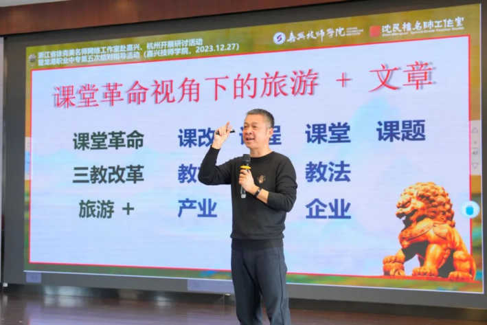 嘉兴技师学院副校长沈民权的讲座《课堂革命视角下的旅游“+文章”》从课堂革命、三教改革、旅游+三方面全面介绍了学校旅游服务专业在课程建设和成果提炼,充分彰显了学校旅游高水平专业的水准和影响力。