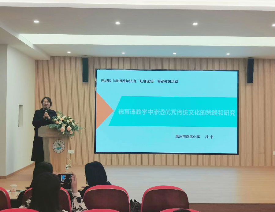 工作室学员温州市岙底小学徐余老师作《德育课教学中渗透优秀传统文化的策略和研究》的专题讲座,她指出德育课程是渗透中华优秀传统文化的核心课程之一,我们教师要重视对教学内容的重组与优化,根据不同年级学生的认知特点,挖掘其中的传统文化内涵,拓展教学资源,丰富课程内容和形式。其次要创设丰富多彩的教学情境和组织形式多样的体验活动,提高学生参与课堂学习的积极性,同时注重课后教学活动的拓展与实践,引导学生认识到中华优秀传统文化的独特性和重要价值,促进学生的全面发展。