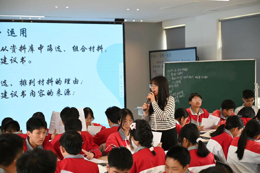 第二节课,苍南县桥墩镇第一中学的包佳佳老师带来了《材料组合式文本阅读策略》。包老师由前段时间大火的百丈漈热门打卡话题入手,通过“昔日网红如何成为长红”的问题导入、引发同学们的热烈讨论,借助导引板块的题组邀请小组代表阐述具体解题思路,再由导引作业迁移至课堂资料库,依据材料撰写建议书。