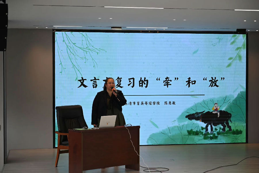 下午是为观点交流、讲座环节。来自乐清市育英寄宿学校的陈慧敏老师就文言文复习的方法作观点交流,她从自身教学实践谈起,指出了文言文复习教学中盲目积累的误区,并结合复习导引、往年省内中考卷等材料及刘倩倩老师的课堂,提出了新颖深刻的观点见解:文言文复习要有“牵”有“放”,要“牵住”文言文言文体式的特点,“放开”一些纯粹语法意义和和知识教学的纠缠,“领着”学生从言文相融的立场去考量,把握关键句、辨析核心词。