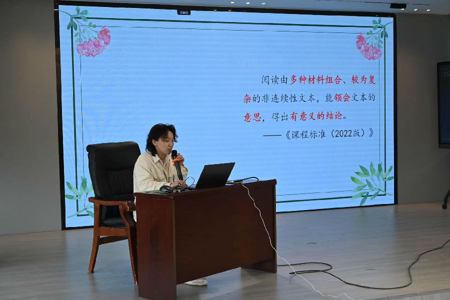 来自温州市南浦实验中学的胡亚纳老师则聚焦非连文本的复习,追根溯源,明晰非连文本的阅读能力指标,并梳理了22年、23年省内中考非连文本的考查点,得出非连文本试题的共性:与生活实际密切相关,情境任务指向解决真实问题,体现高阶思维与素养,而包佳佳老师的课堂逻辑与之紧密贴合。最后,胡老师分享了自己的案例设计,从专题复习和日常教学两个维度拆解非连文本教学的策略,深入浅出地揭示了非连文本的教学精髓。